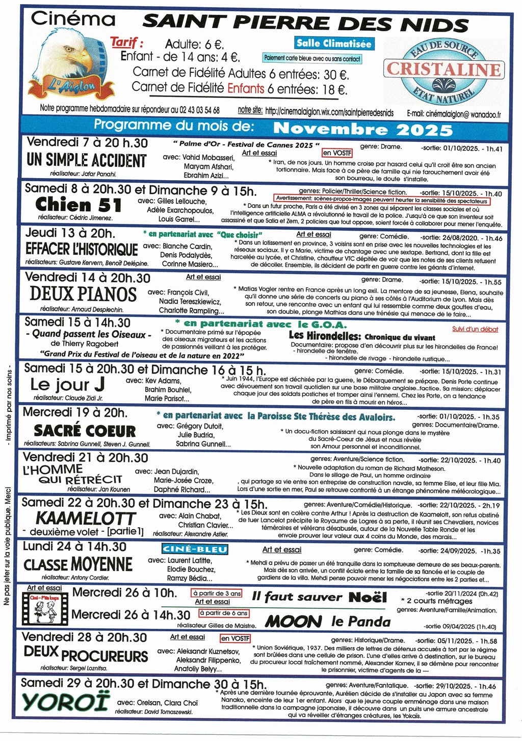 - Les hirondelles - quand passent les oiseaux : après-midi documentaires en partenariat avec le GOA suivi d'un débat sur les hirondelles, comment les reconnaître. Quelles espèces vivent chez nous ? Suivi de l'occupation des nichoirs installés à St Pierre des Nids.