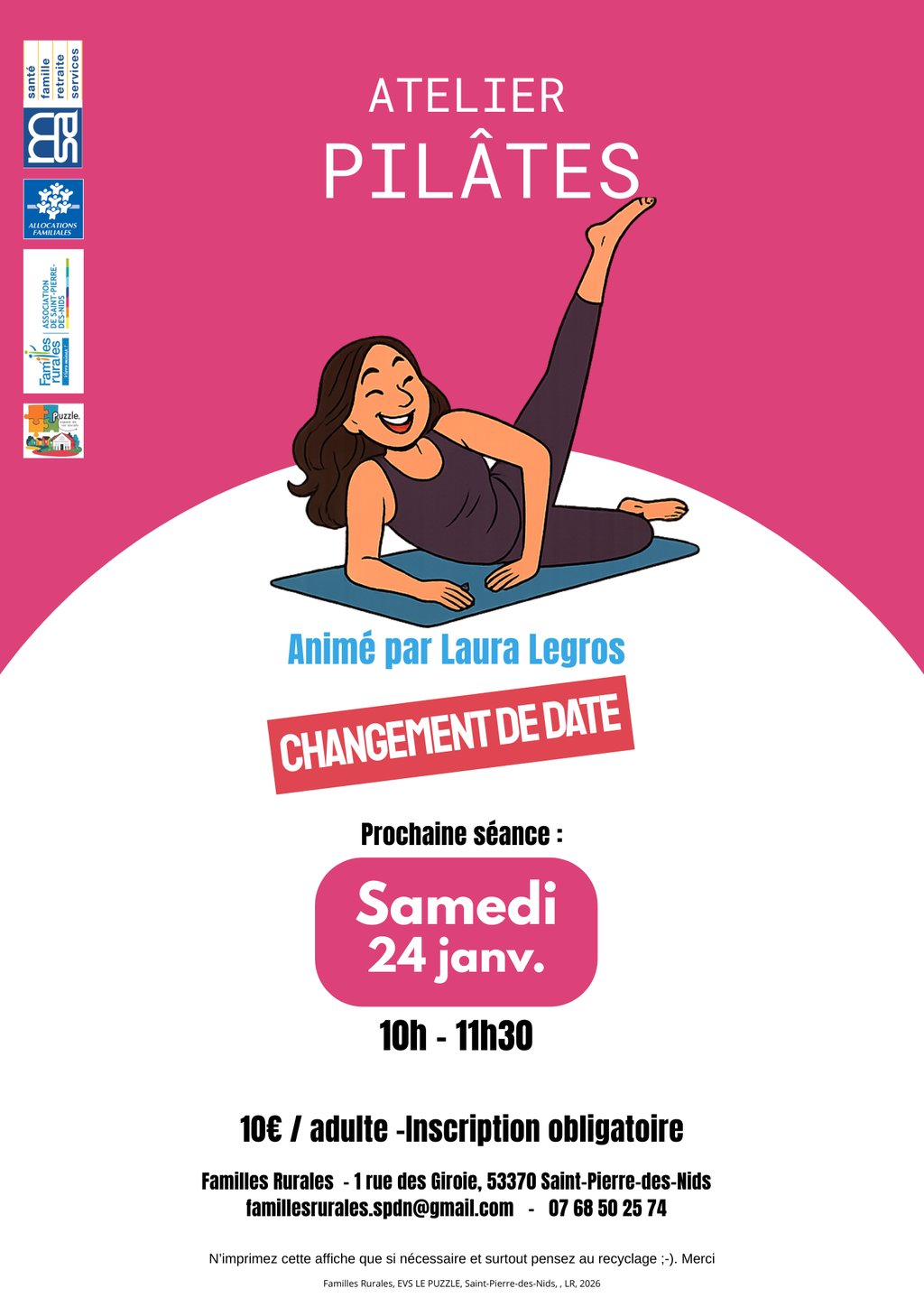 Le prochain cours de Pilâtes animé par Laura Legros sera le 𝟮𝟰 𝗝𝗮𝗻𝘃𝗶𝗲𝗿 (Et non le 20) ! N'oubliez pas de vous inscrire !